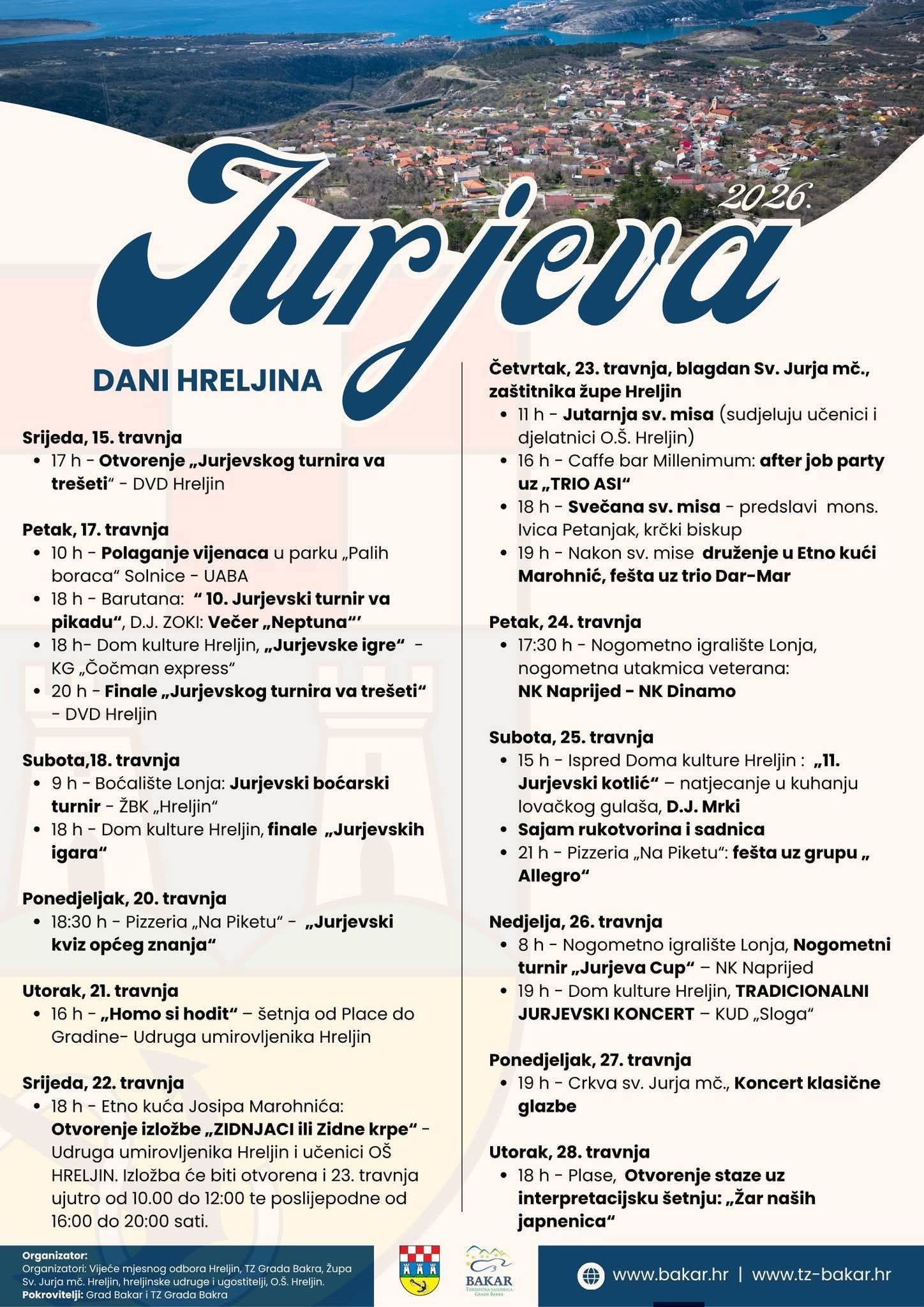 Organizatori: Vijeće mjesnog odbora Hreljin, TZ Grada Bakra, Župa Sv. Jurja mč. Hreljin, hreljinske udruge i ugostitelji, O.Š. Hreljin.